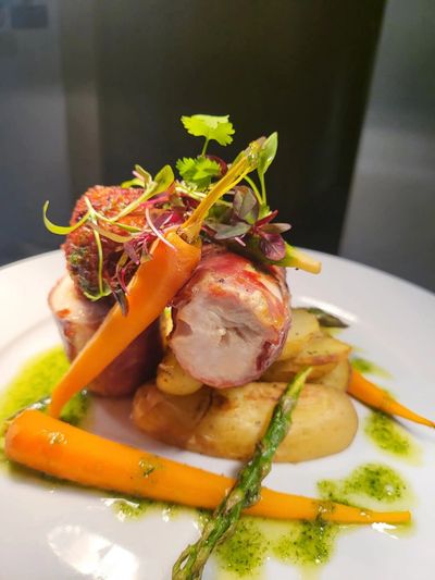 Pork belly - bacon, chilli jam - chorizo bon bon - roasted cabbage